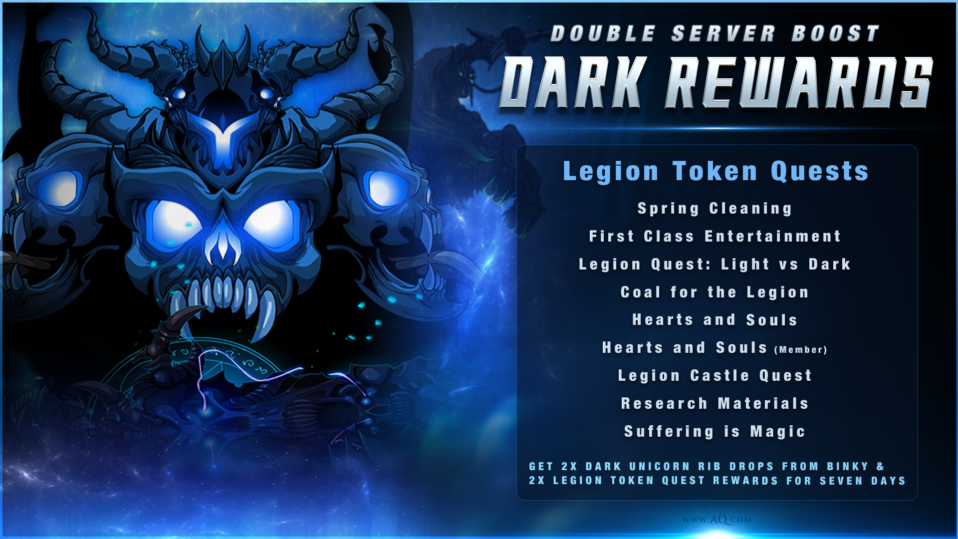 Get double rewards from select Legion Token quests and a chance of getting 2x Dark Unicorn Rib drops from Binky all week long. More details