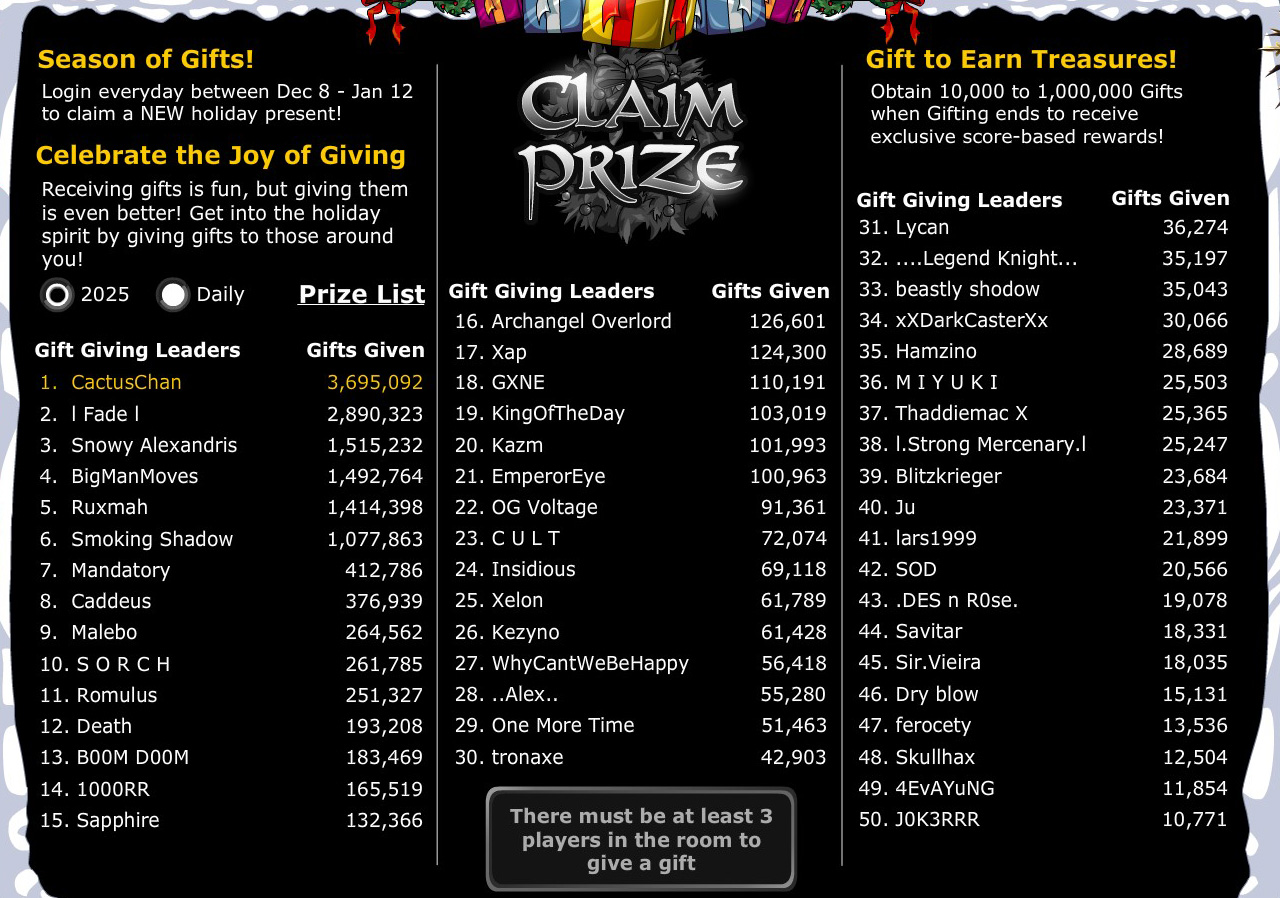 EpicDuel's 2025 Gifting season is nearly 5 days in and already our Gifters have put up unbelievable scores! We already have 6 Gifters with over 1 million gifts given, and from what I hear, the Gifters are just getting started!