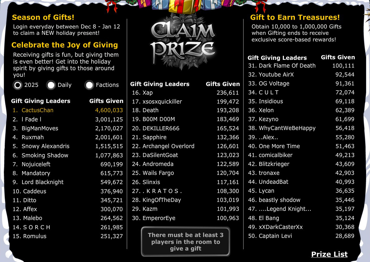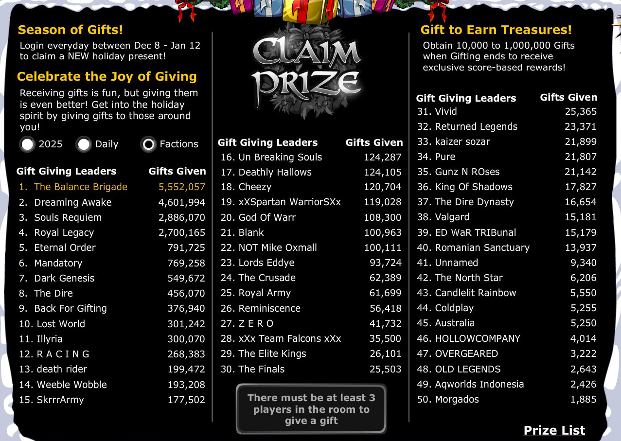 The recently-implemented Faction Gifting leaderboard has been interesting to watch as well, showing The Balance Brigade with a commanding 5.5+ million gift score. Dreaming Awake is close behind in 2nd place with Souls Requiem and Royal Legacy duking it out for 3rd. Overall, this was a fascinating addition to this year's Gifting event as it shows the potential power of Gifting as a team effort.
