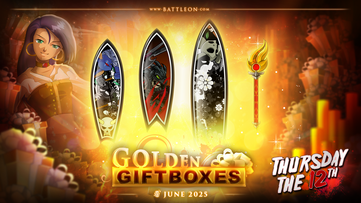 Prepare for the shadows to descend! This month's Golden Giftboxes are arriving with the eerie energy of the second unluckiest day of the year - Thursday the 12th! Dare to unwrap darkness variants of your favorite board weapons and carve your path into the abyss. Also discover the newly updated Inferno Scepter, now even more potent for wielding the summer's blazing power. And make sure to pick up the returning variants of Mason Armor and Faces, Krieger Klaws, Deatharrows Cat, plus over 30 returning board weapons!