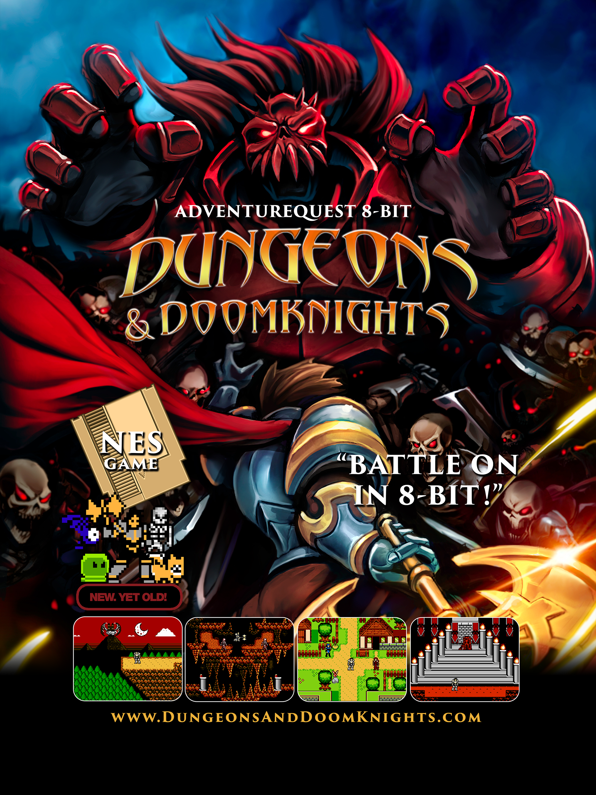 Dungeons and DoomKnights is a new game for the NES. You can play it on your computer using an emulator, or play on actual hardware buy buying a cart. The game is in final testing and the box/manual/bonuses are being produced now. It will be shipping as soon as it passes full testing.