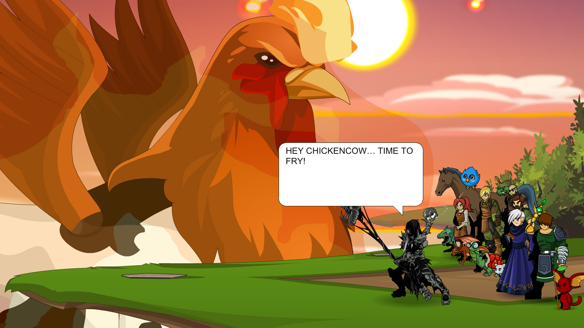 For several weeks, a mysteriously egg-shaped meteor has been flying closer and closer to Battleon… and today it CRASHED into Battleon*, wiping out much of the town. Upon impact, the meteor… hatched?!?!... into a terrifyingly titan-sized, fowl beast: A GIANT CHICKENCOW?! O_O