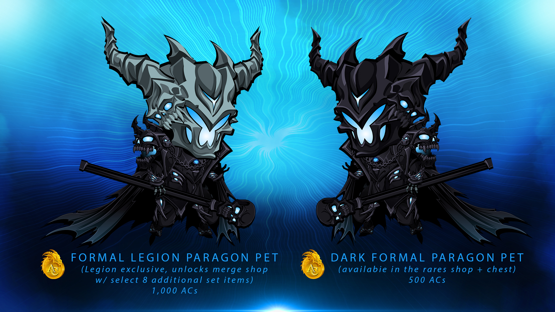 Next Friday, the Dark Formal and Formal Legion Paragon pets arrive! Members of the Undead Legion can unlock a very special version of the Formal Underworld Paragon Pet which comes with a Legion Token merge shop that unlocks select items in the armor set.