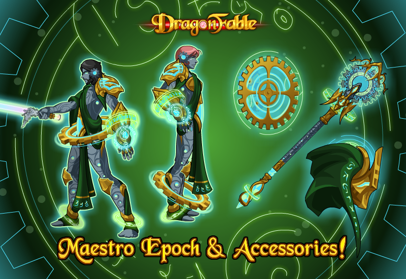 We also have a set of cosmetic accessories available from the Time Shop in Cysero's Superstore! The Maestro's Staff, Gear, and Mask can be purchased for 400 Dragon Coins each.