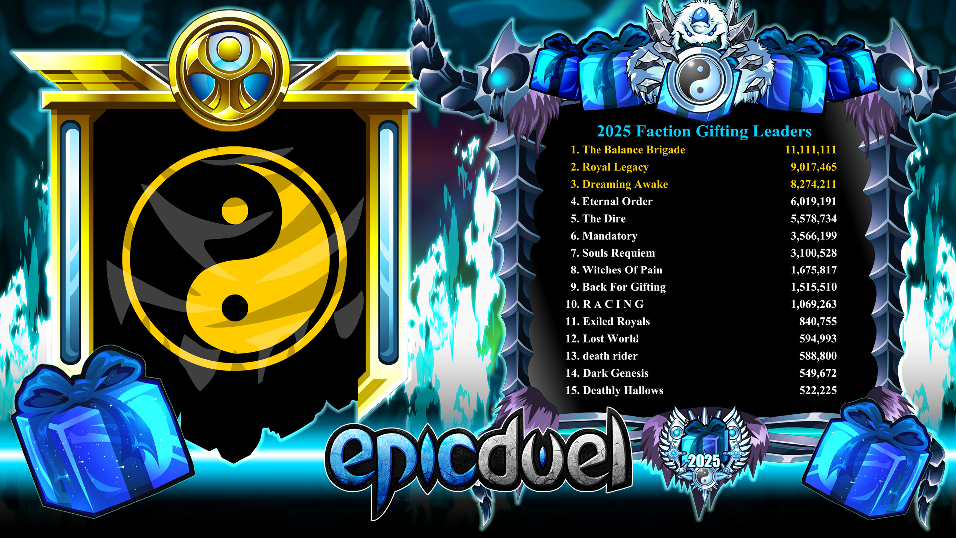Since this was the first year we've recorded Faction contributions to the Gifting scores, we should highlight the top 3 Factions in this year's Gifting season: