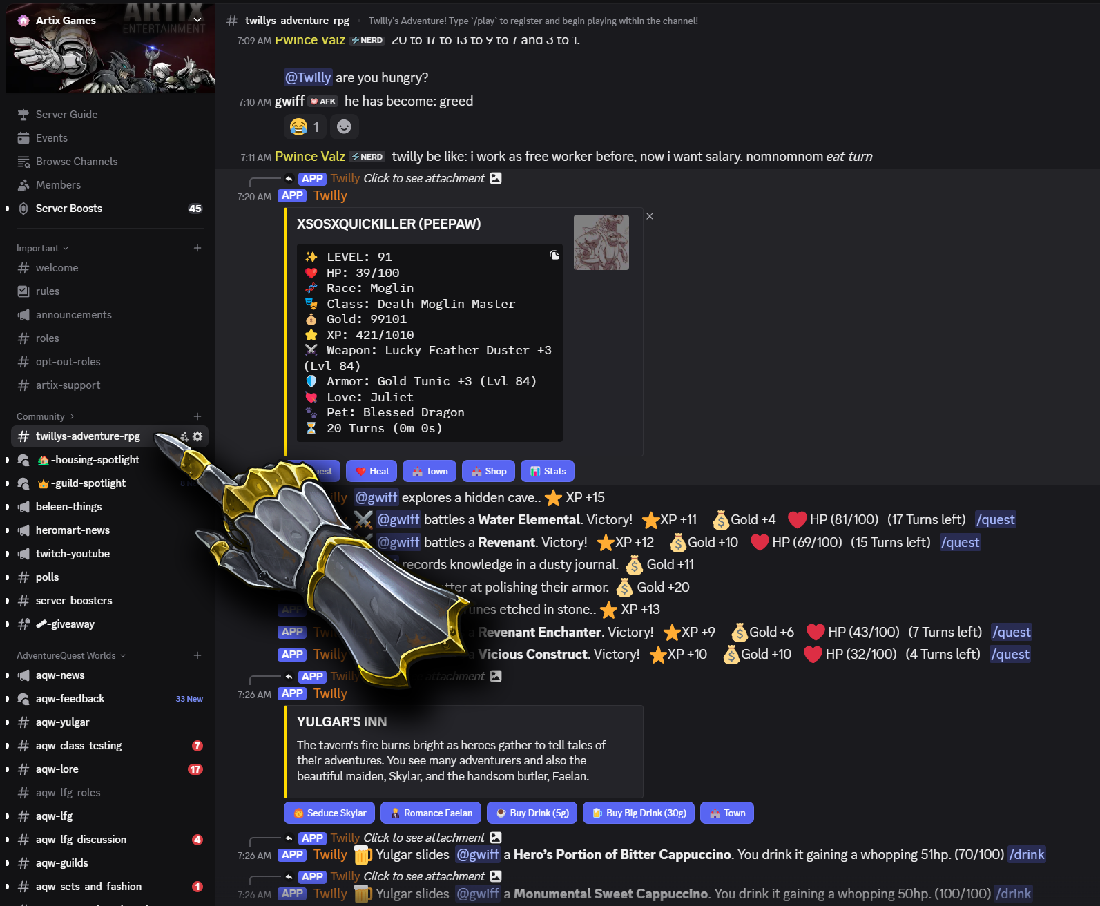 Goodmorning! If you have not already seen it, I made a little fantasy RPG that you can play inside of discord. It is a throw back to the text based game I used to play when I was little called Legend of the Red Dragon. This was before the internet, when dinosaurs still roamed the earth, and you had to connect to random computers with your smoke-signal-speed modems. Now you can have a similar experience on the Artix Games Discord. I wrote the bot in C# and SQLite as a learning project. It is running on a little server that sits next to me. Sometimes, late at night, I make random new features. Sometimes they do not break the game. Sometimes....